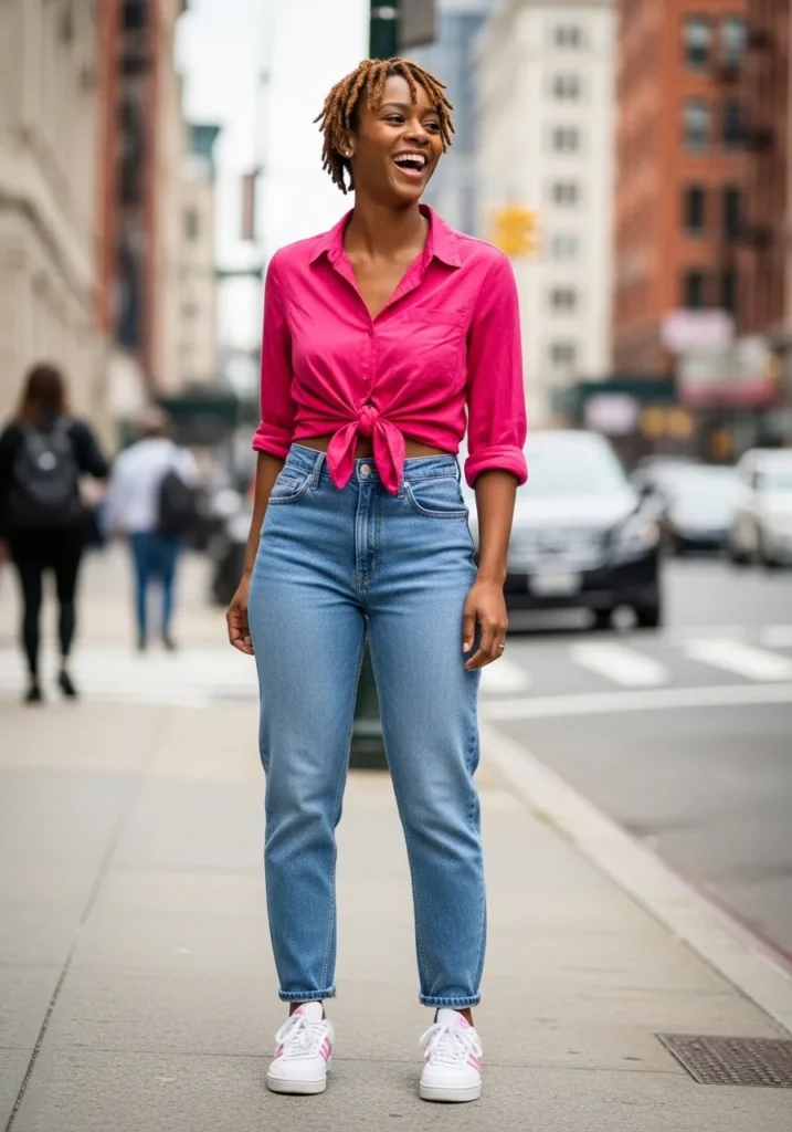 This outfit features a bright pink button up shirt tied at the waist and styled with classic straight leg blue jeans and sneakers. The shirt fabric looks lightweight and airy while the jeans keep the look casual and grounded. The overall vibe feels playful relaxed and effortless.