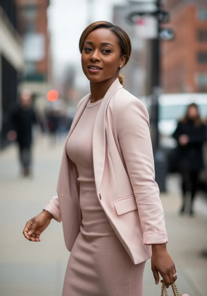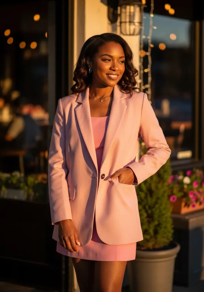 This outfit pairs a soft blush blazer with a matching fitted dress underneath for a sleek and polished birthday look. The tailoring keeps everything sharp, while the gentle pink tone softens the overall vibe. It feels modern, city ready, and quietly confident.