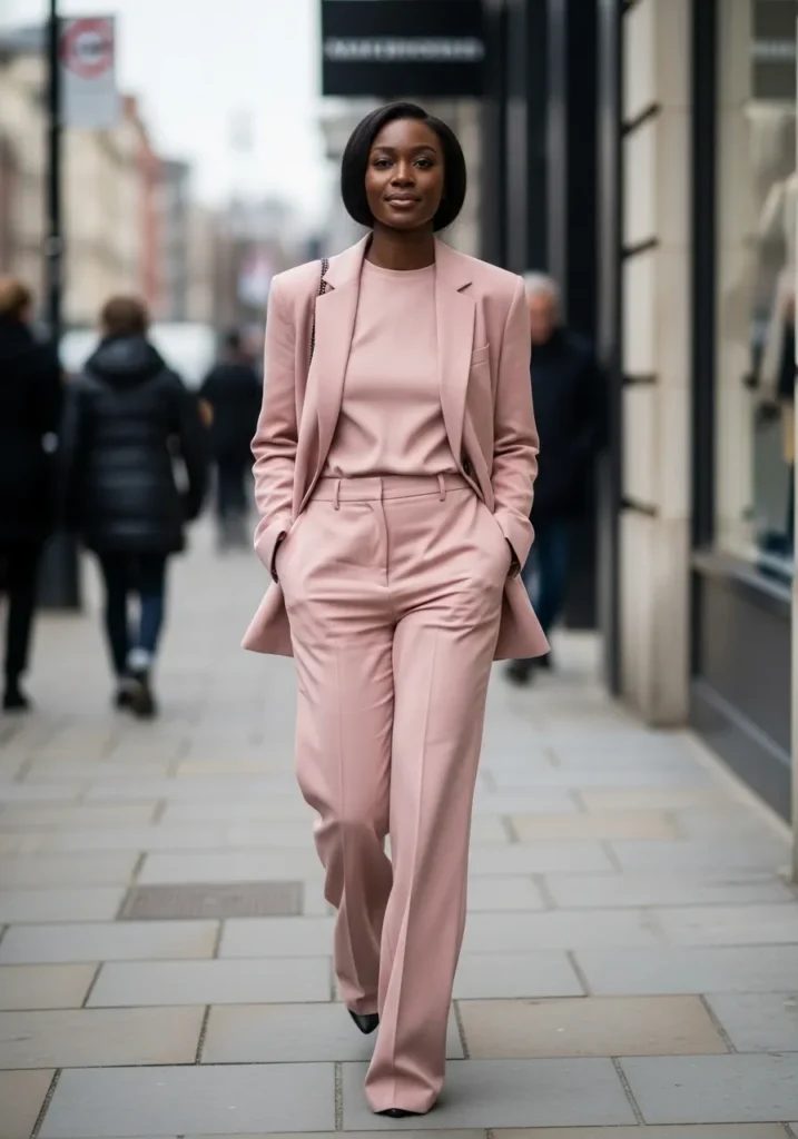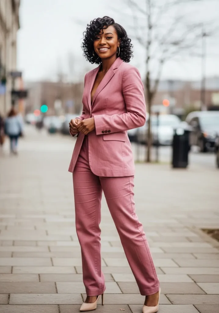 A tailored pink suit with a fitted blazer and matching trousers creates a strong yet refined birthday outfit. The structured silhouette brings a confident edge, while the muted pink tone keeps it soft and celebratory. Clean heels finish the look with polish.