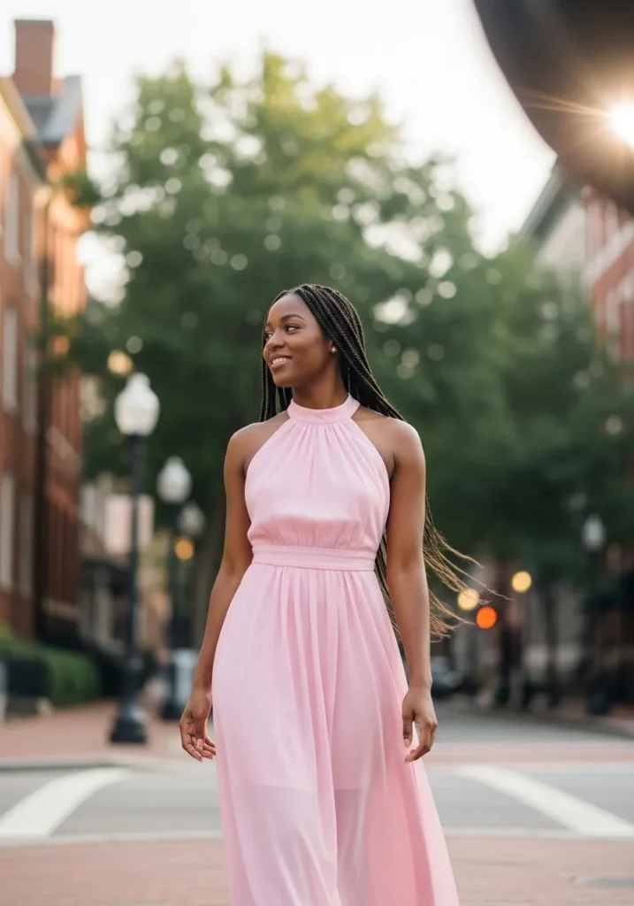 A soft pink maxi dress with a fitted top and flowing skirt creates a graceful and romantic birthday outfit. The lightweight fabric moves beautifully while walking, and the subtle sheen adds elegance. The look feels airy and timeless.
