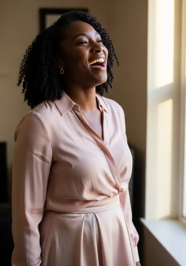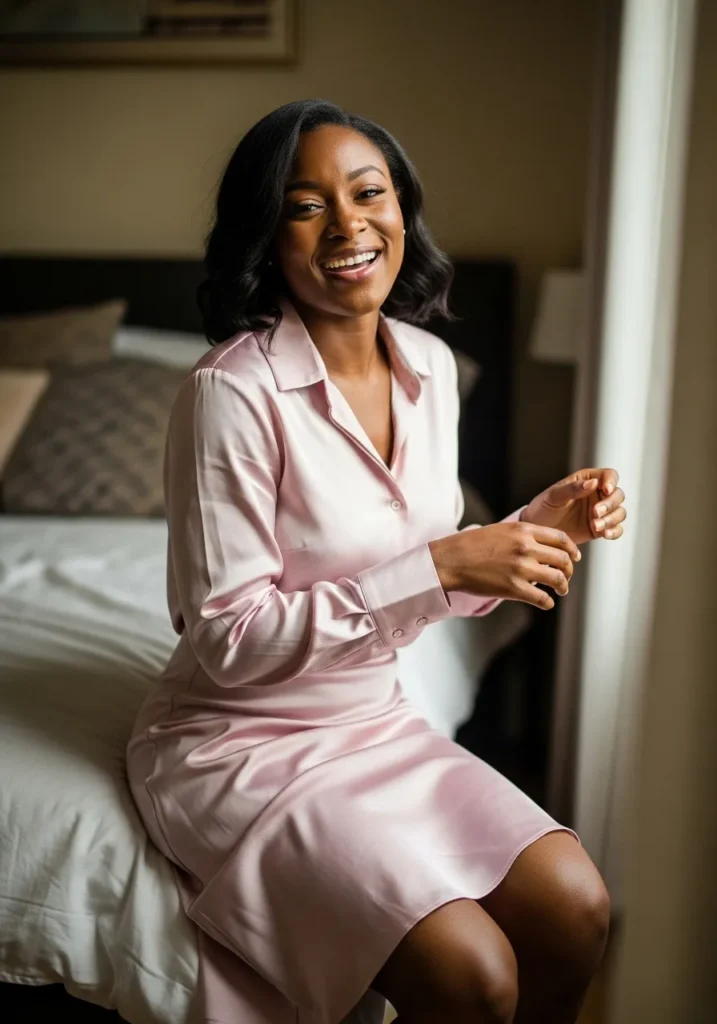 This outfit features a silky blush button down shirt styled as a dress for an effortlessly polished birthday look. The soft satin fabric adds a subtle glow, while the relaxed fit keeps it comfortable and intimate. The overall vibe feels cozy yet elevated, perfect for a quiet birthday moment or getting ready photos.