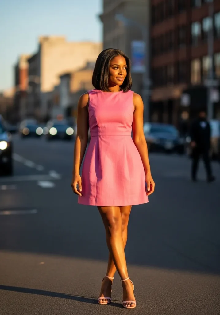 A structured pink mini dress styled with simple heels creates a chic and modern birthday look. The tailored fit keeps it polished, while the shorter length adds a playful touch. The solid pink color keeps everything cohesive.