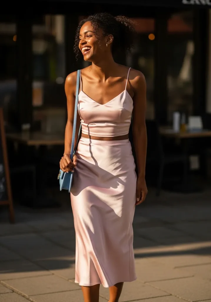 A blush satin midi dress with thin straps creates a refined and timeless birthday outfit. The smooth fabric drapes gently, and the fitted bodice keeps the look polished. Paired with simple accessories, it feels effortlessly chic.