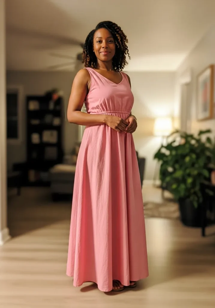 A floor length pink dress with a simple sleeveless cut creates an elegant and timeless birthday outfit. The fabric flows smoothly from the waist down, giving the look a graceful and calm presence. The soft pink shade keeps it romantic and refined.
