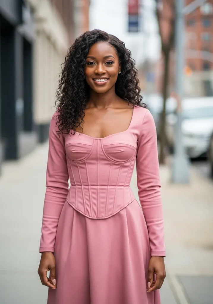 This look features a pink corset style dress with long sleeves for a balance of structure and softness. The fitted bodice highlights the waist, while the skirt keeps the look gentle and feminine. The overall feel is polished with a hint of romance.