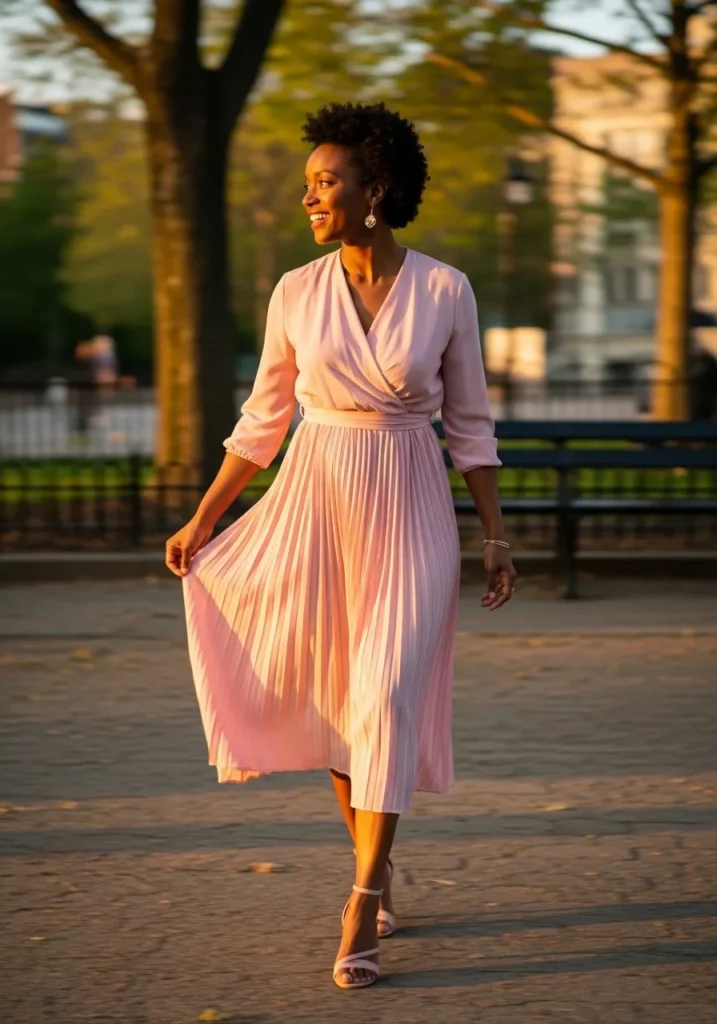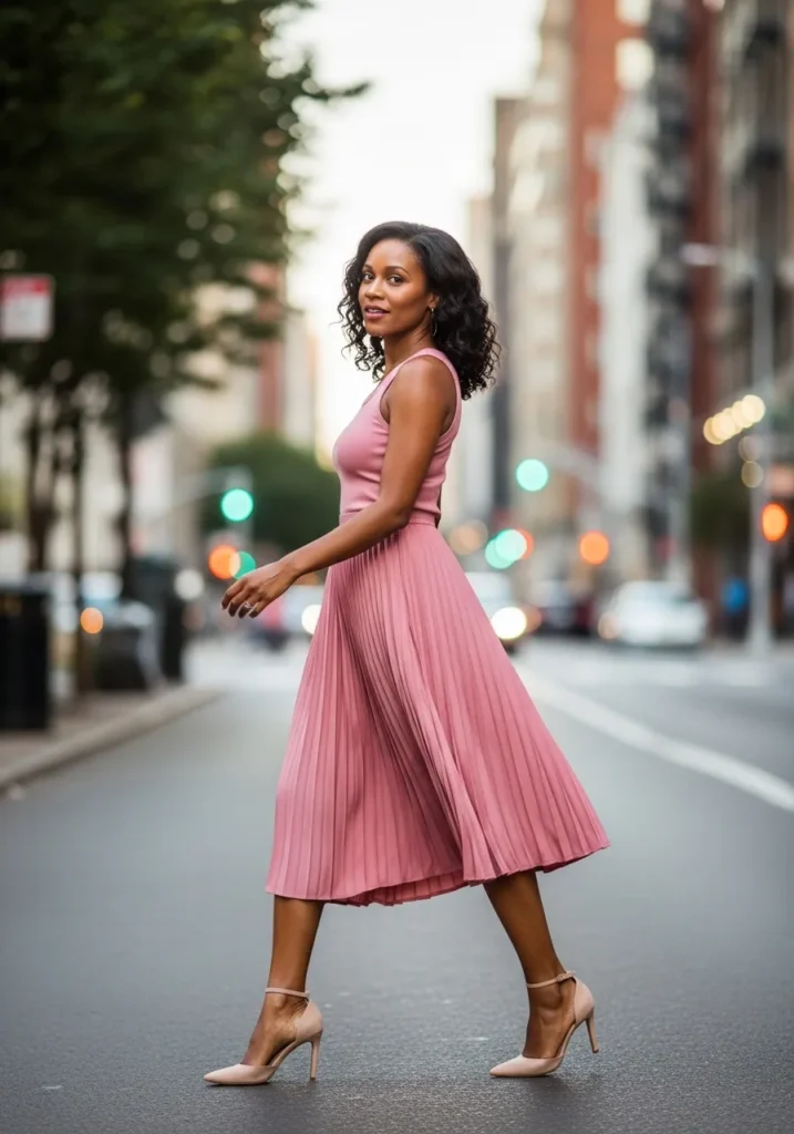 A flowing pink midi dress with a fitted bodice and airy skirt creates a timeless birthday look. The soft pleats and gentle movement add texture, making it visually interesting from every angle. Simple heels keep the focus on the dress.