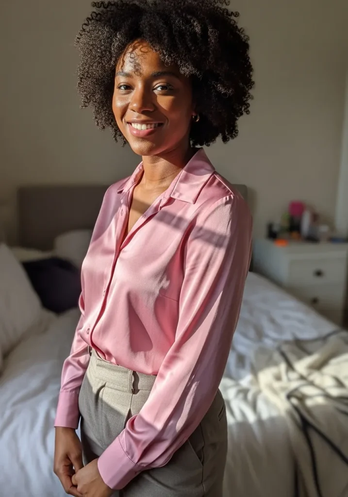 This outfit uses a silky pink button down styled neatly for a refined birthday look. The satin fabric adds a subtle shine, and the relaxed fit keeps it comfortable yet polished. The vibe feels intimate and effortlessly chic.