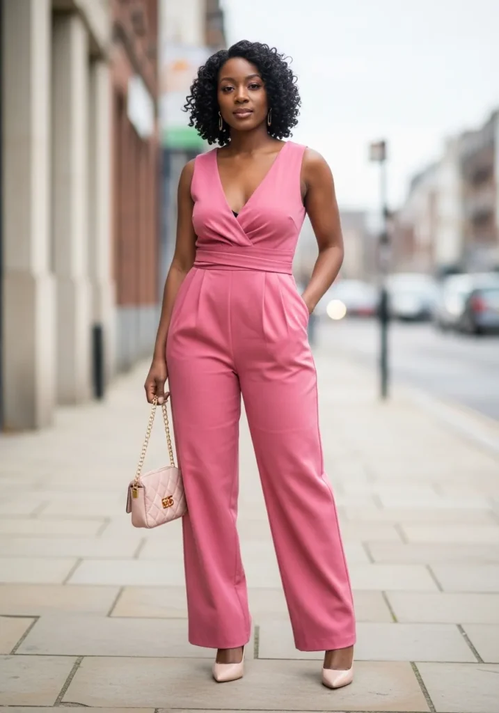 This tailored pink jumpsuit features a deep neckline, fitted waist, and wide leg silhouette for a refined yet modern vibe. The solid pink tone keeps it cohesive, while the structured cut gives it a polished and confident feel. A small handbag completes the look with ease.