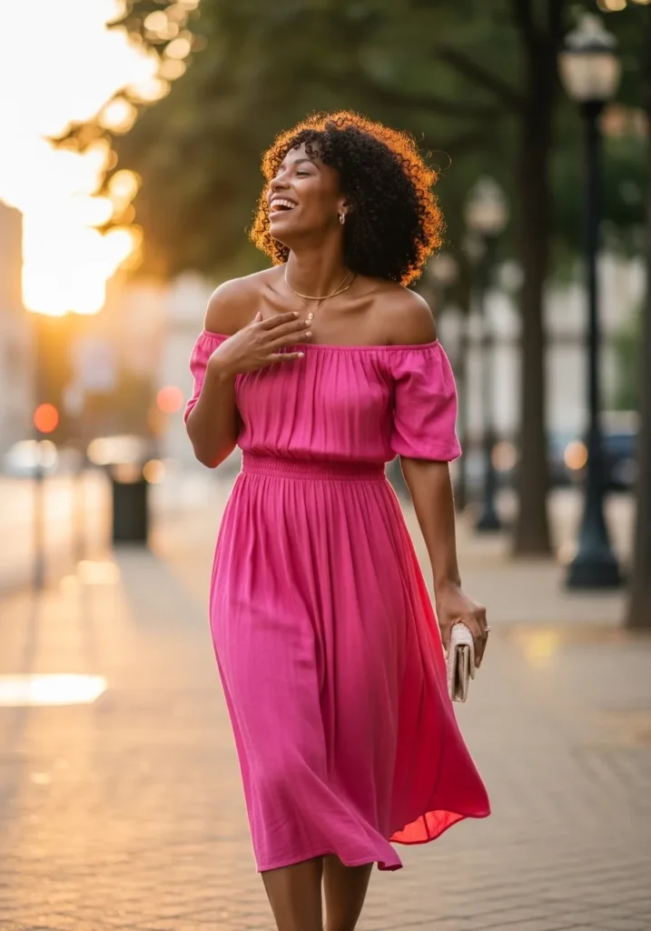 An off the shoulder pink dress with a flowy skirt creates a soft and romantic birthday outfit. The exposed shoulders add elegance, while the gentle movement of the fabric gives it a playful touch. The color pops beautifully in natural light.