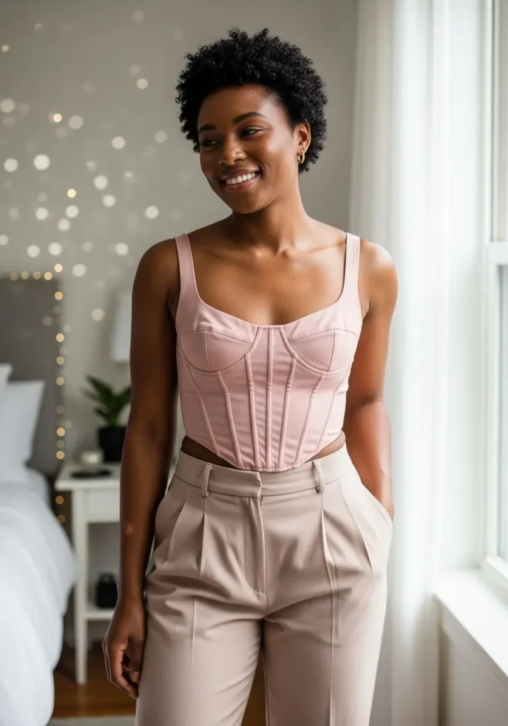A blush corset style top paired with light neutral trousers creates a chic and fashion forward birthday look. The structured bodice adds definition, while the softer bottoms keep the outfit balanced and refined. The overall palette feels clean and modern.