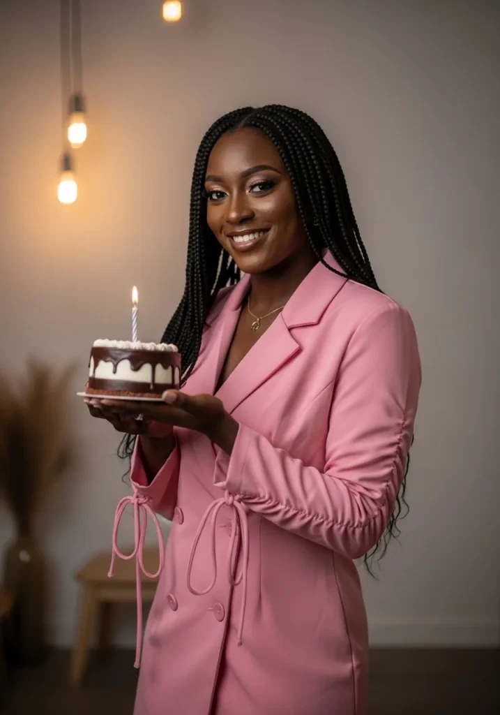 A matching pink blazer and trousers create a clean and powerful birthday outfit. The structured fit keeps everything sharp, while the soft pink color keeps it celebratory and feminine. Paired with simple accessories, it feels timeless.