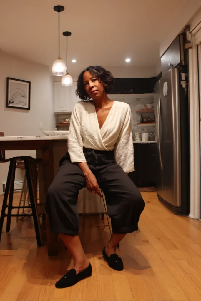 This look pairs a soft cream wrap top with loose black pants that have an easy drape. The top has a pretty textured fabric that feels elevated without being fussy and the pants keep everything relaxed and comfortable. The black flats add a simple polished touch that fits the laid back mood.