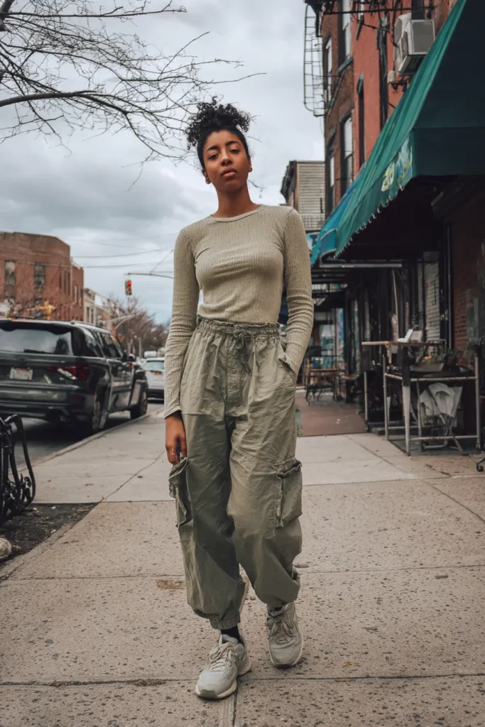 This outfit features a fitted ribbed top in a soft neutral shade paired with loose olive cargo pants. The cargo silhouette adds a fun relaxed edge and the light sneakers make everything feel easy and practical. The look has a cool casual vibe that feels modern.