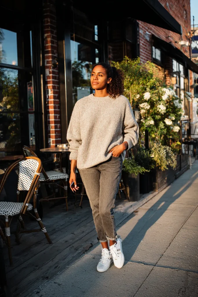 This look pairs a soft oatmeal sweater with easy straight leg jeans in a washed grey shade. The sweater has that loose comfy fit that always looks effortless and the rolled sleeves make it feel even more relaxed. The white sneakers keep everything clean and simple which works so well for a casual dinner out.