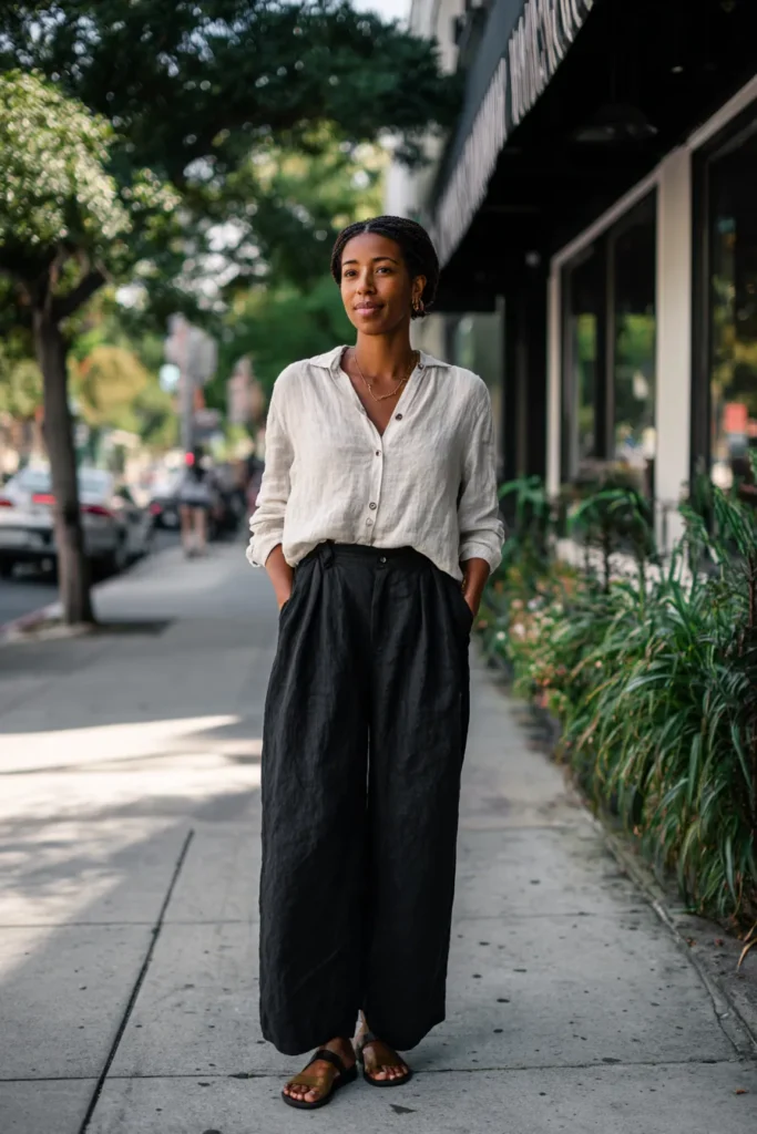 This outfit blends a breezy linen button up with flowy black wide leg pants that move beautifully. The shirt is tucked just enough to define the waist and the sandals add a soft natural finish. The whole look is relaxed and polished in that very quiet confident way.