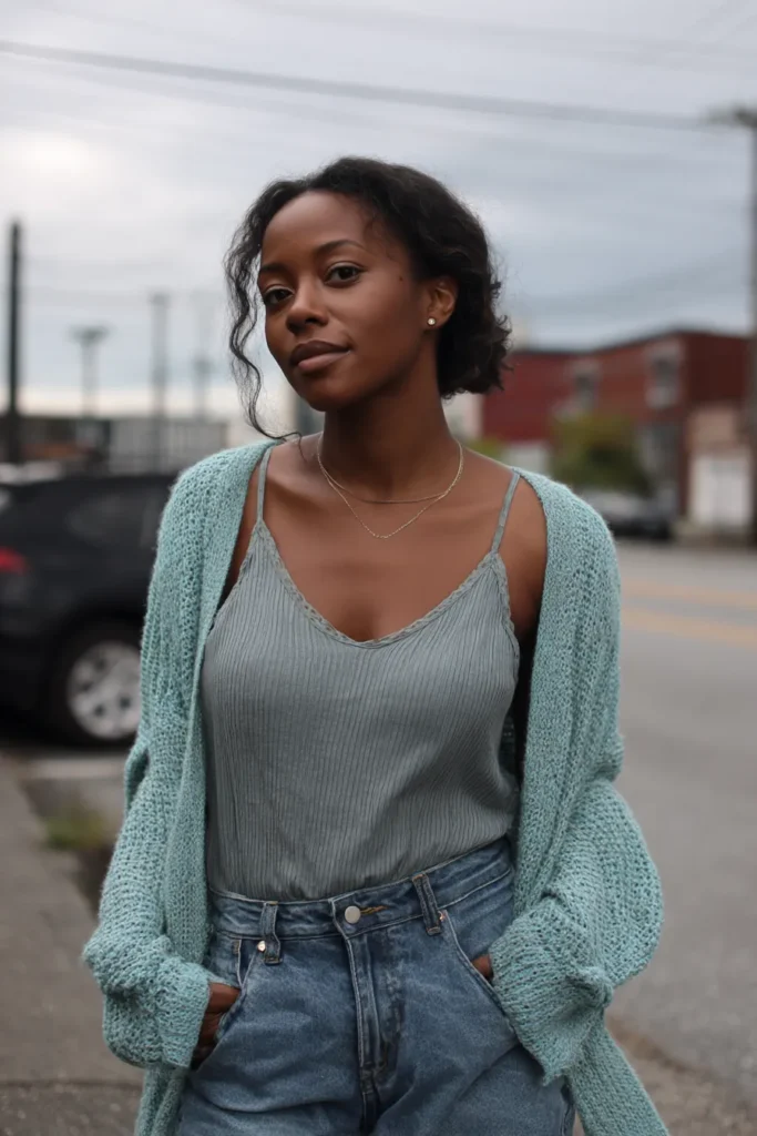This look features a ribbed camisole in a muted sage tone layered under a chunky knit cardigan in a matching airy shade. The high waist blue jeans keep the outfit grounded and give it a relaxed cozy vibe. The combination feels soft and feminine without being fussy.