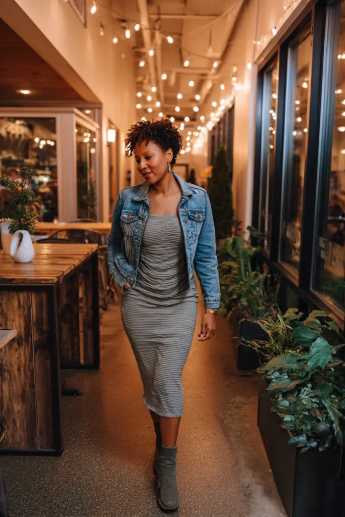 This outfit pairs a simple ribbed grey midi dress with a classic denim jacket that adds structure and ease. The suede ankle boots keep the look grounded and practical while still keeping things chic. The mix of textures creates a relaxed but polished mood.
