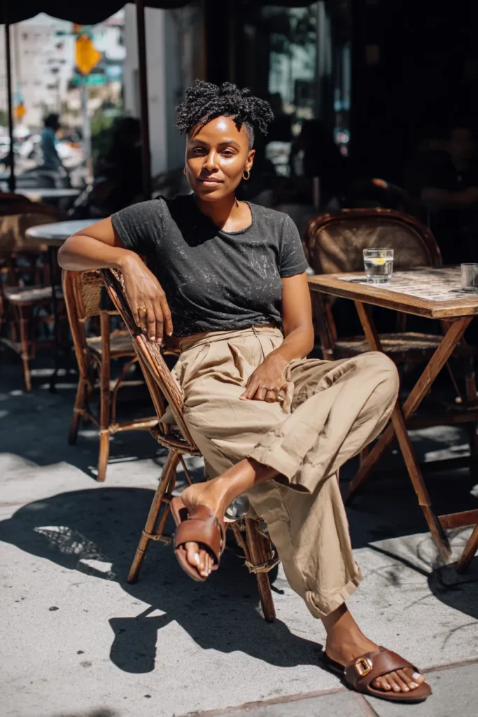 This outfit uses a faded black tee tucked into loose khaki trousers with soft pleats. The brown slide sandals tie everything together and keep it natural and warm. The look is simple and timeless with a chilled everyday feel.