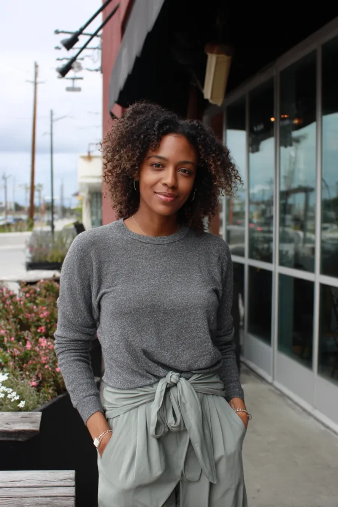 This look features a fitted grey knit paired with sage green pants that tie at the waist. The fabric has a soft drape and the high waist adds a little structure. The outfit feels balanced and effortless with a calm neutral palette.
