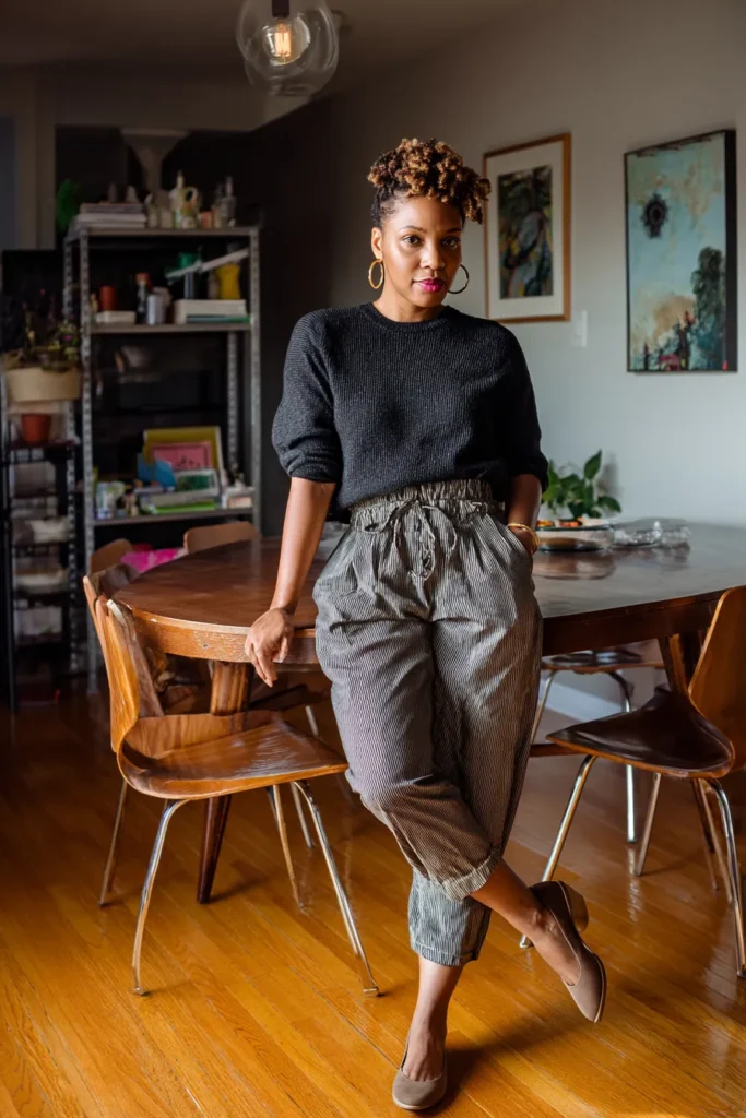 This outfit has a textured black sweater paired with subtle striped jogger style pants. The tapered legs give it a flattering shape and the neutral flats make the look feel simple and chic. It is cozy and stylish in the best low key way.