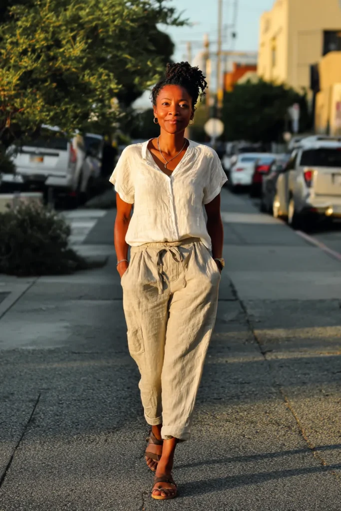 This outfit features a loose linen top in a warm ivory shade paired with matching linen trousers. The fabric moves easily and the tied waist gives a gentle shape. Brown sandals finish the look with a natural earthy feel.