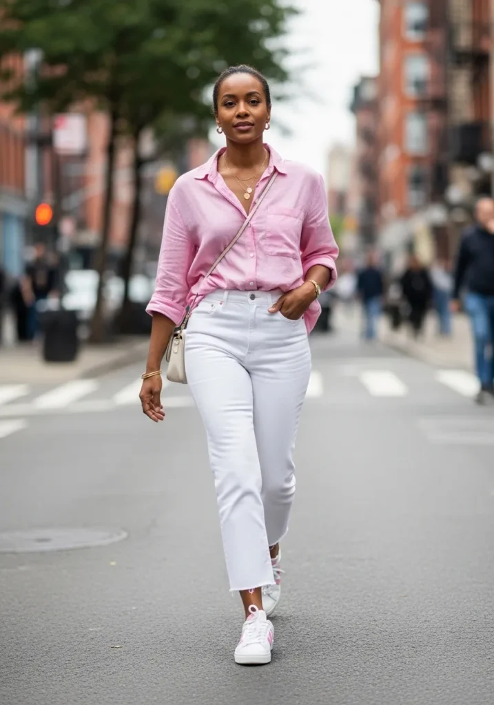 This outfit pairs a light pink button down shirt with crisp white jeans and matching white sneakers.