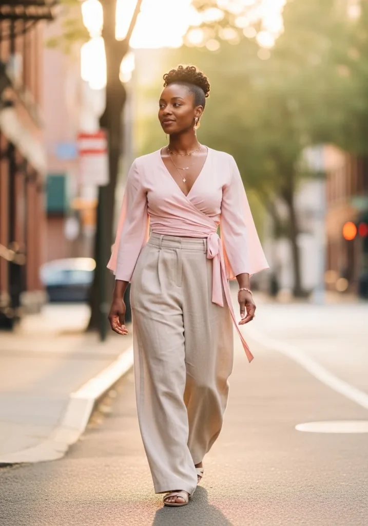 This look features a soft pink wrap style blouse paired with loose beige wide leg pants.