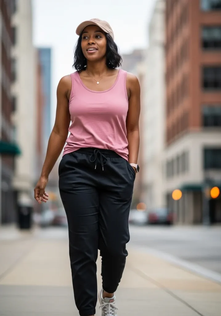 This outfit pairs a simple pink tank top with relaxed black jogger pants and sneakers.