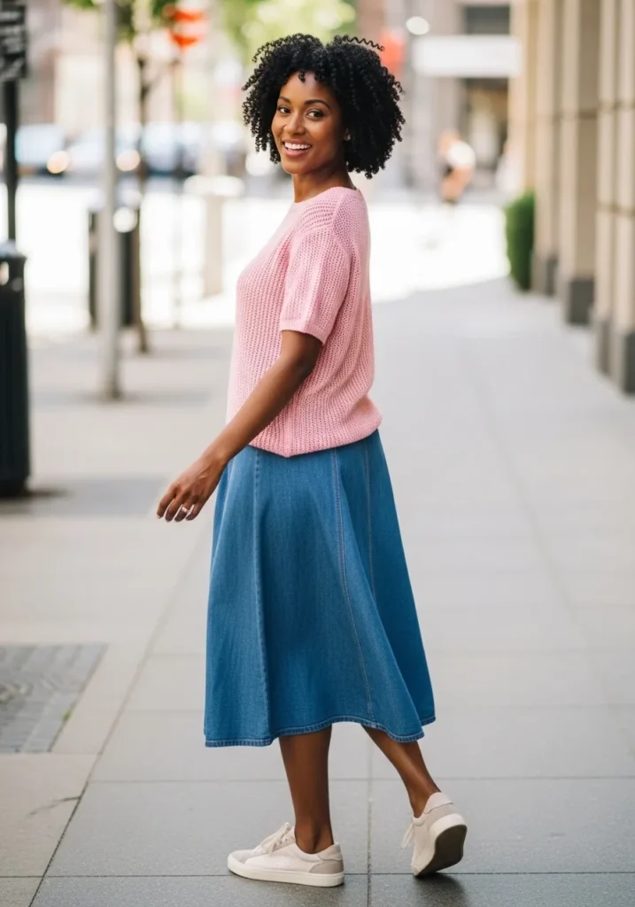 This look combines a relaxed pink T shirt with a blue flowy midi skirt and flat shoes.
