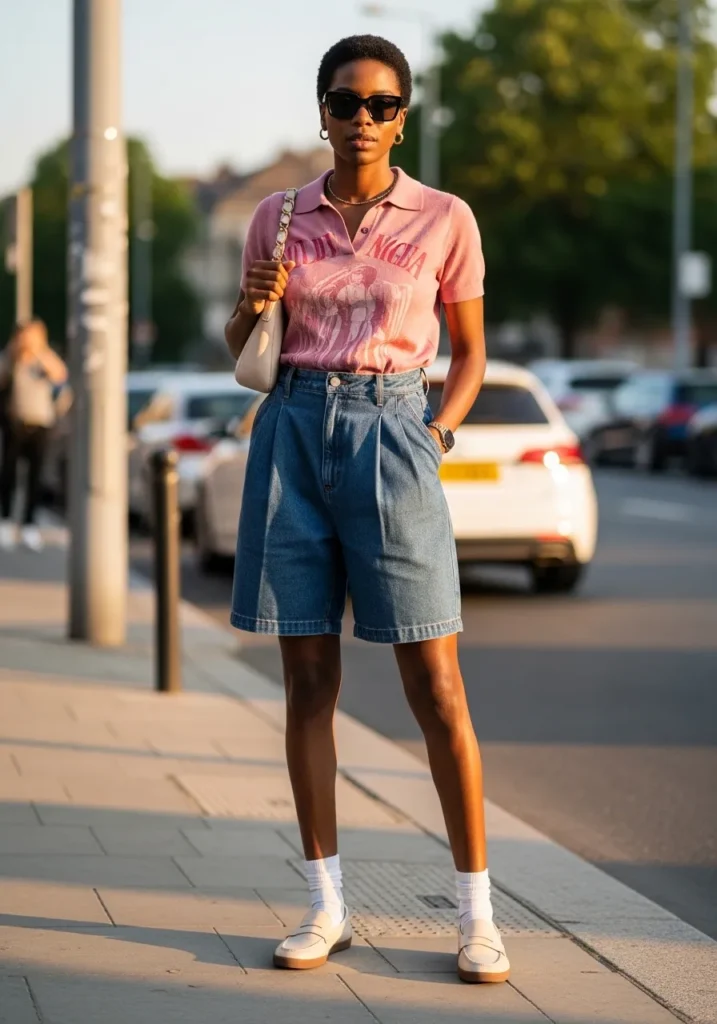 This outfit combines a pink graphic T shirt with classic blue denim shorts and sneakers.