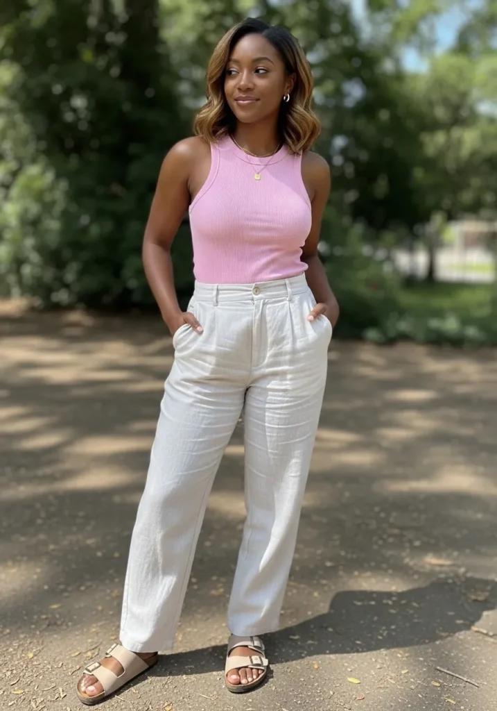 This outfit combines a soft pink sleeveless tank with loose white trousers and flat sandals.