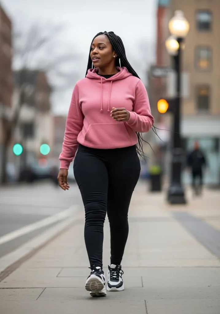 This look features a dusty pink hoodie styled with classic black leggings and sporty sneakers.