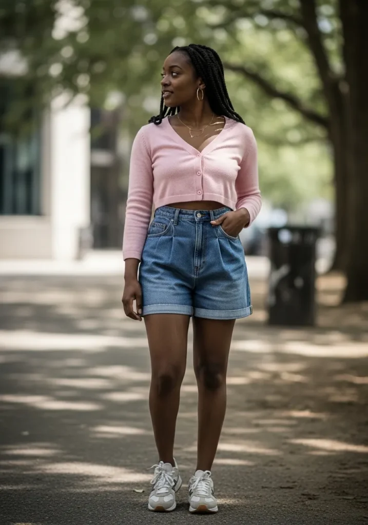 This look features a fitted pink long sleeve top paired with classic blue denim shorts and sneakers.