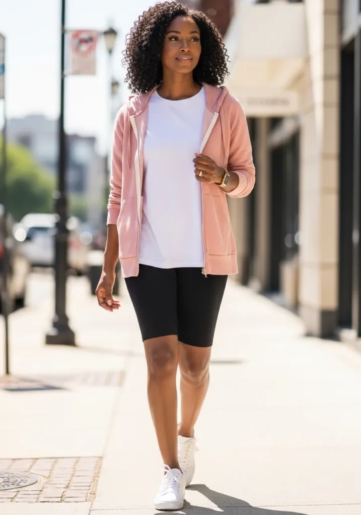 This look features a light pink open cardigan layered over a simple top and black bike shorts.