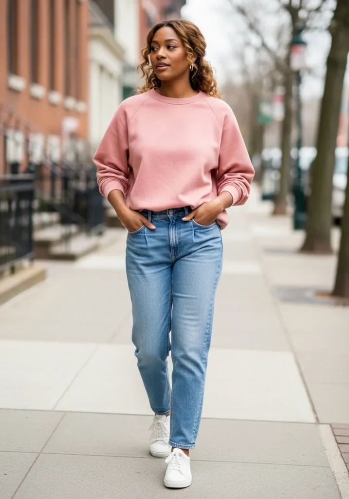 This outfit combines a soft pink crewneck sweatshirt with relaxed blue jeans and white sneakers.