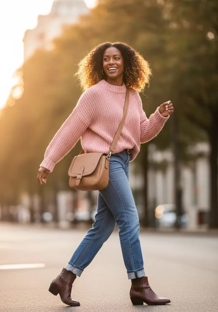 This look features a cozy textured pink sweater paired with light wash jeans and ankle boots.
