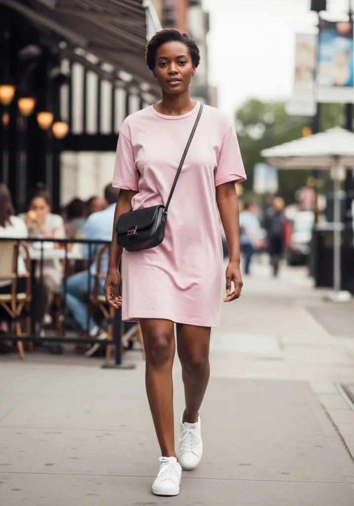 This outfit features a light pink T shirt dress styled with white sneakers and a small crossbody bag.