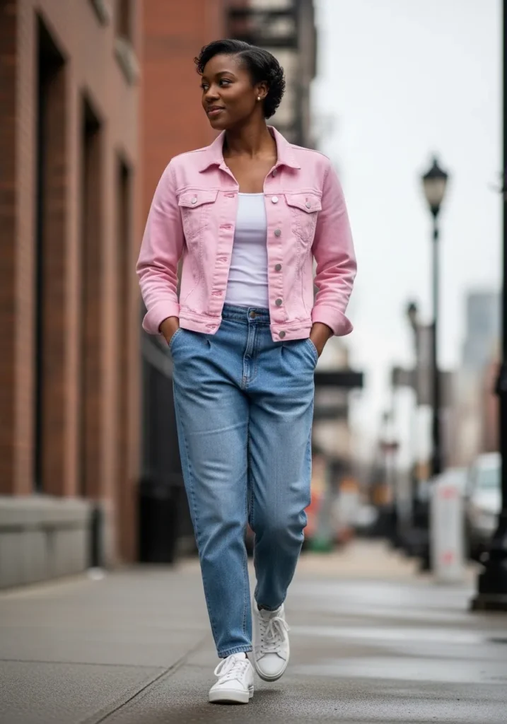 This look pairs a light pink denim jacket with a simple top and relaxed blue jeans.