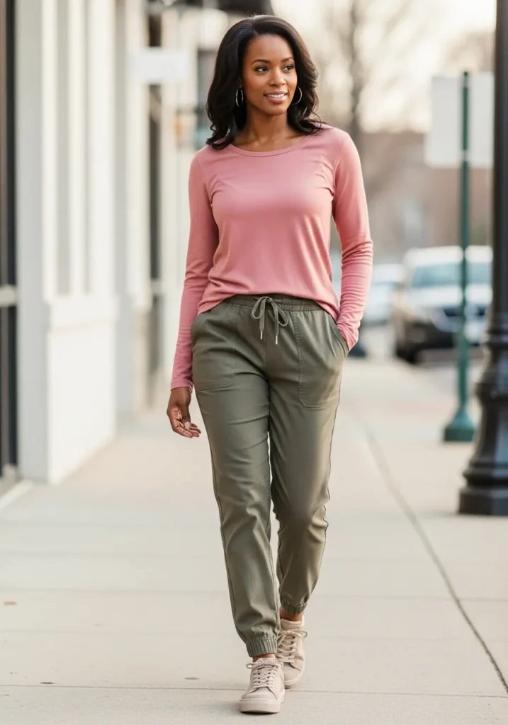 This outfit pairs a soft pink long sleeve top with olive green jogger pants and clean white sneakers.