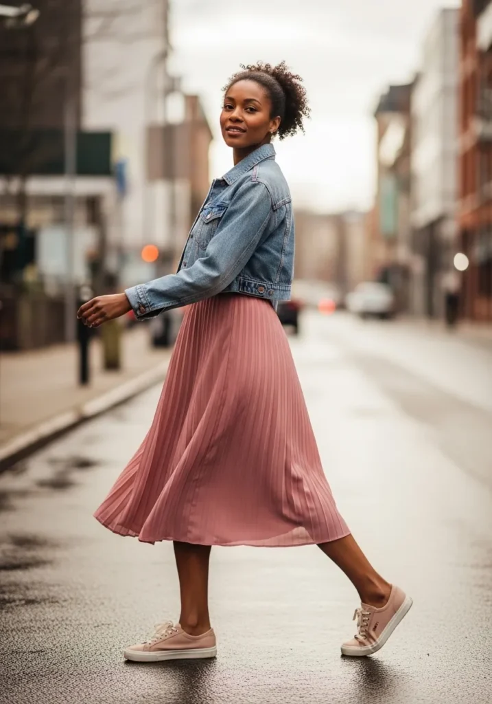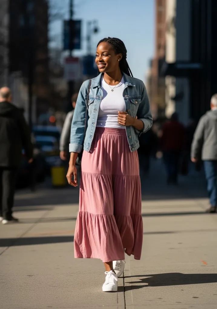 This outfit pairs a flowing pink skirt with a white top, light denim jacket, and sneakers. The skirt brings femininity, while the denim jacket keeps it grounded and casual. The mix feels modern and effortless.