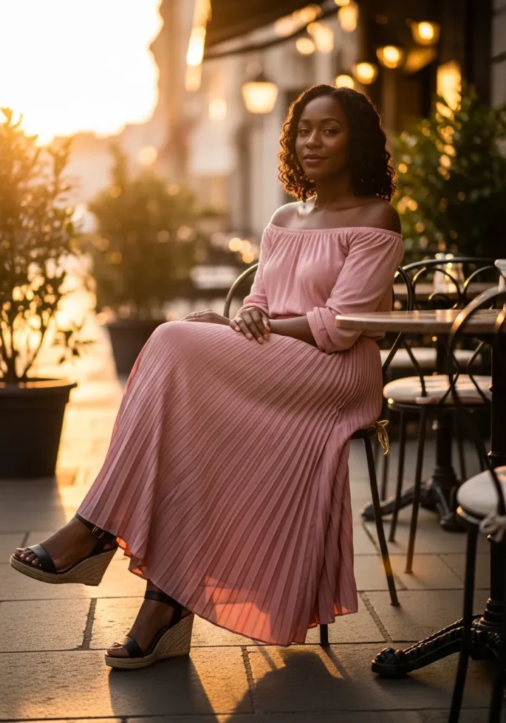 This look showcases a pleated pink midi skirt styled with an off shoulder knit top and delicate sandals. The pleats add movement and texture, while the knit keeps everything relaxed and romantic. It feels soft, graceful, and very wearable.
