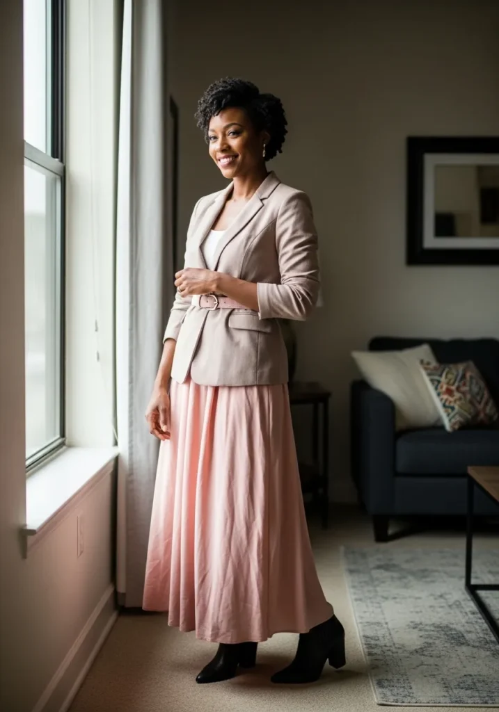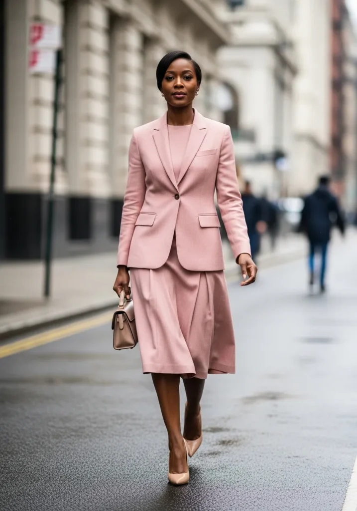 This outfit showcases a tailored pink blazer paired with a coordinating pink skirt and neutral heels. The structure gives it a powerful, polished feel, while the soft pink shade keeps it approachable and elegant.