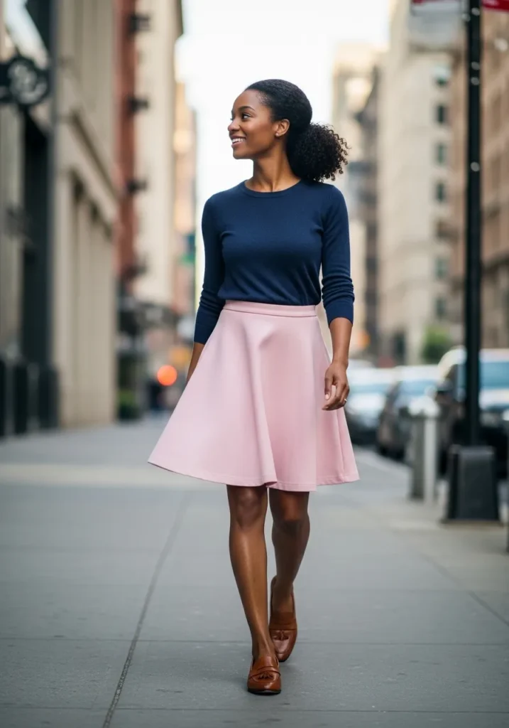 This outfit combines a pink A line skirt with a fitted dark top and classic heels. The contrast keeps the look sharp, while the skirt adds softness and movement. The silhouette feels flattering and balanced.