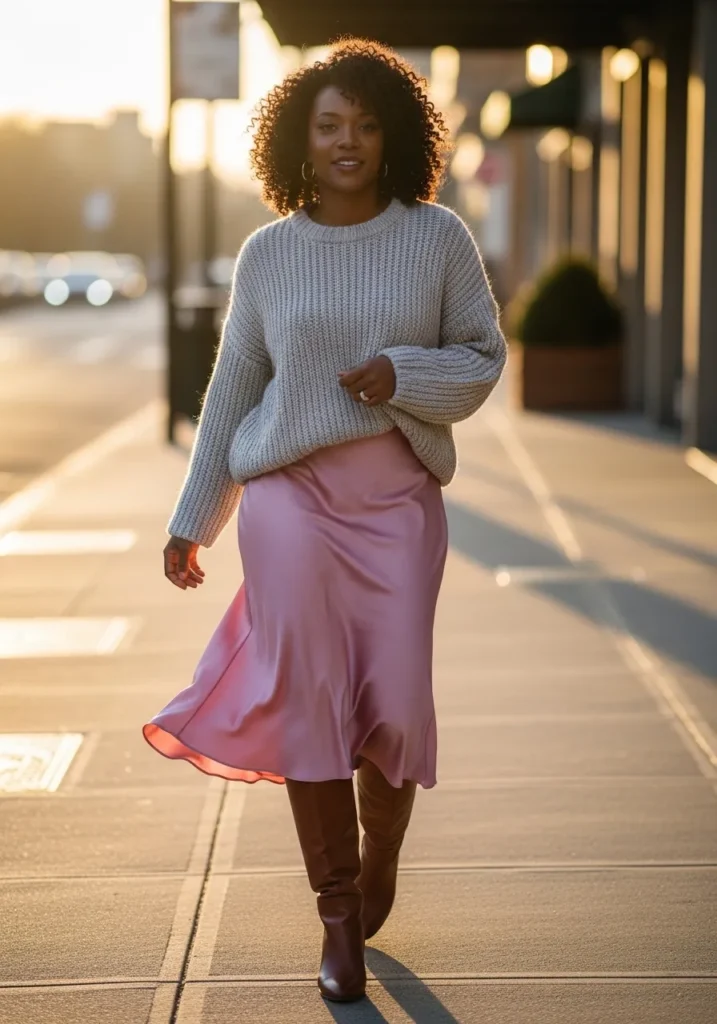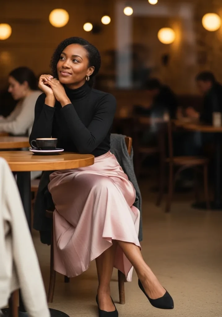 This look pairs a satin pink midi skirt with a fitted black knit top and heels. The shine of the satin elevates the outfit instantly, while the knit keeps it clean and simple. It feels elegant and grown up.