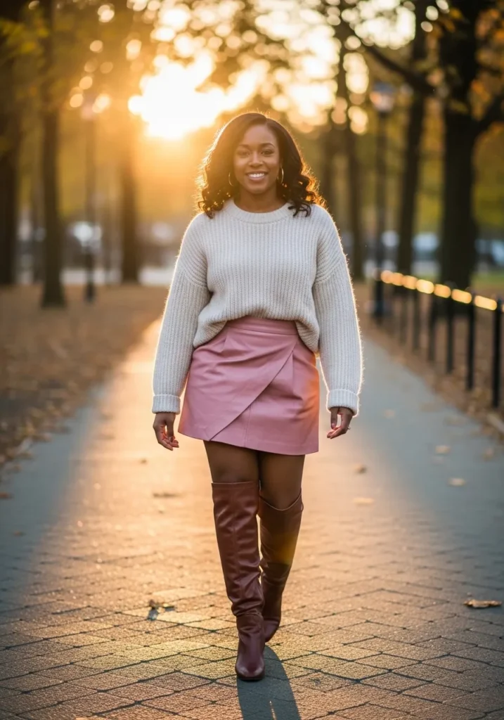 This outfit features a pink wrap style skirt worn with a soft sweater and knee high boots. The wrap detail adds interest, while the sweater keeps the look cozy and balanced. The vibe feels warm and stylish.
