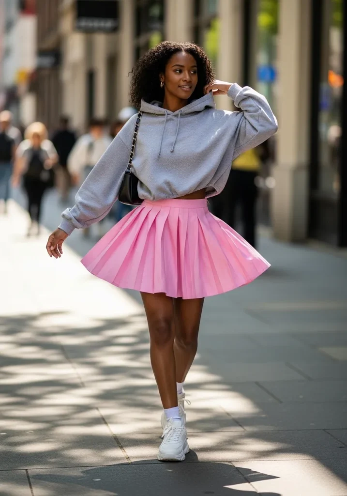 This look showcases a short pink skirt styled with a casual hoodie and sneakers. The contrast between sporty and feminine makes the outfit feel playful and modern. It looks fresh and full of personality.