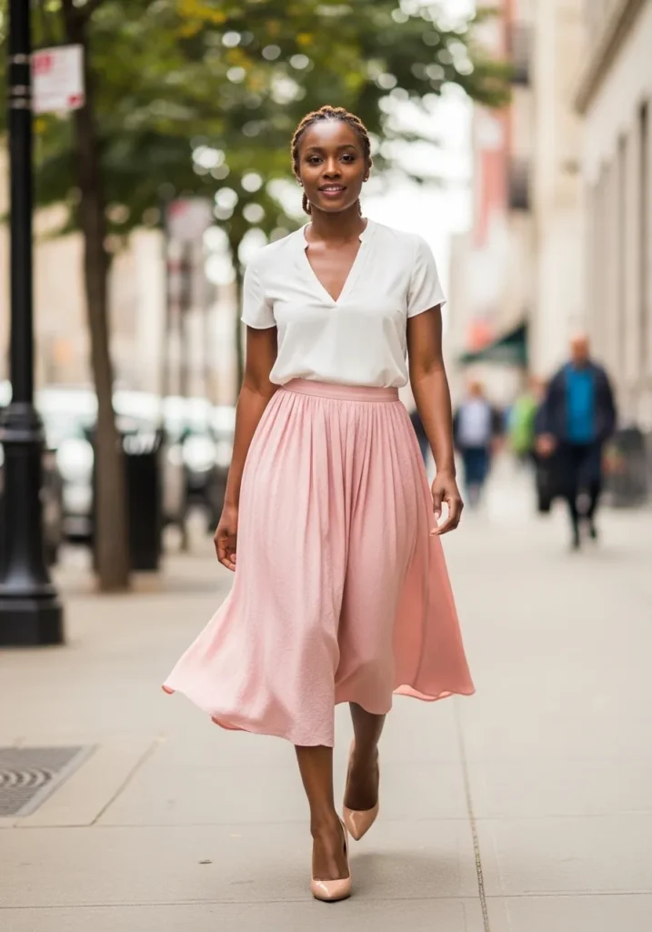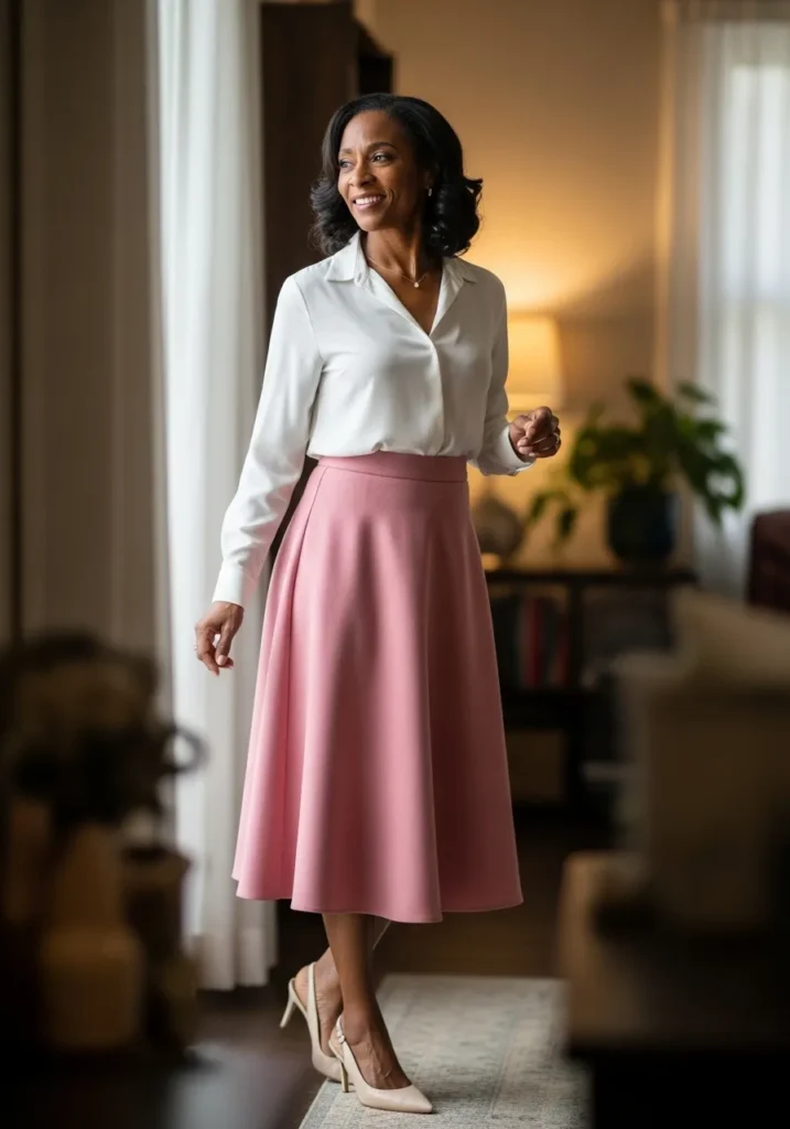 This outfit pairs a soft pink midi skirt with a crisp white blouse and classic heels. The blouse feels light and structured, while the skirt adds movement and femininity. The overall look feels clean, elegant, and perfectly balanced.