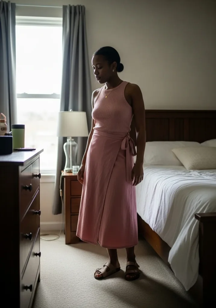 This look features a sleeveless pink dress with a midi length hem and simple flats. The silhouette feels relaxed and graceful, with soft fabric that moves naturally. The color keeps it feminine without feeling too bold.