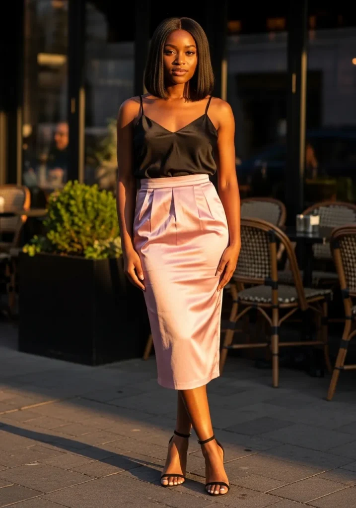 This look features a satin pink midi skirt styled with a fitted black top and heeled sandals. The sheen of the skirt instantly elevates the outfit, while the simple top keeps it balanced and chic. It feels perfect for evening plans.