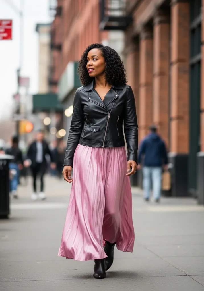 This look combines a flowing pink pleated skirt with a black leather jacket and ankle boots. The skirt adds softness and movement, while the jacket brings contrast and attitude. The balance feels modern and bold.